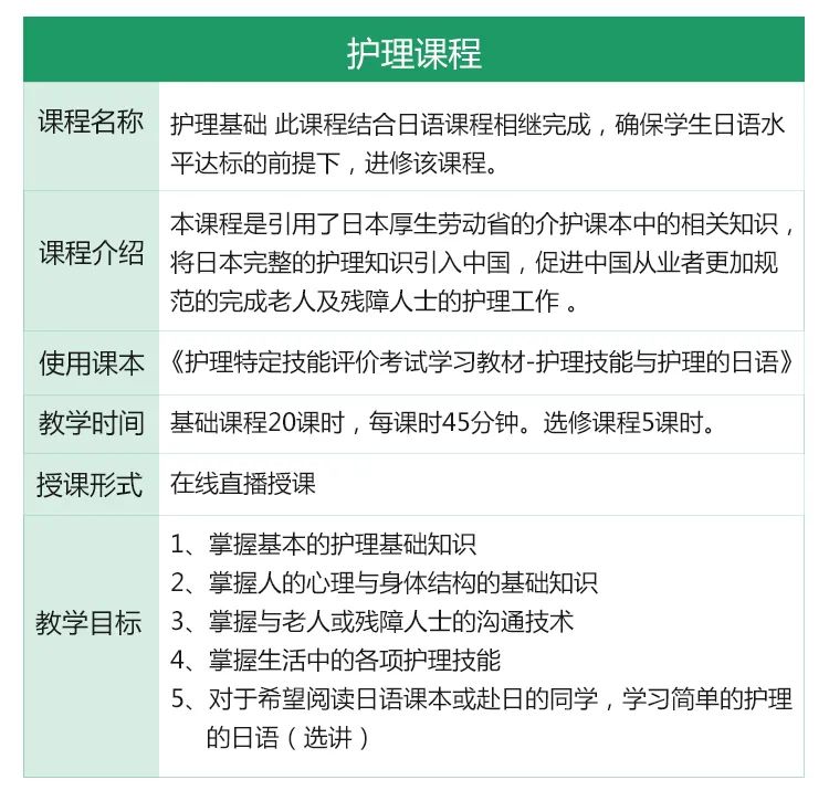 蔚藍康養一直致力于培養康養福祉產業國際人才,蔚藍與全國各地的職業學校合作設立教學基地,教授日語和基礎介護知識,提供留學服務和在日升學、就職服務。
